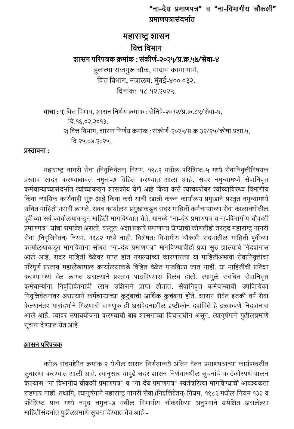 सदरील शासन निर्णयान्वये अंतिम वेतन प्रमाणपत्राच्या कार्यपध्दतीत सुधारणा करण्यात आली आहे. त्यानुसार यापुढे सदर शासन निर्णयामधील सूचनांचे काटेकोरपणे पालन केल्यास “ना-विभागीय चौकशी प्रमाणपत्र” व “ना-देय प्रमाणपत्र” स्वतंत्ररित्या मागविण्याची आवश्यकता राहणार नाही. तथापि, त्यानुषंगाने महाराष्ट्र नागरी सेवा (निवृत्तिवेतन) नियम, १९८२ मधील नियम १३२ व परिशिष्ट पाच मध्ये नमूद नमुना-७ मधील विभागीय चौकशीच्या अनुषंगाने अपेक्षित असलेल्या माहितीसंदर्भात पुढीलप्रमाणे सूचना देण्यात येत आहे.